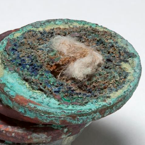 材质与色泽:以青铜为材质(含铜、锡、铅合金),表面因埋藏环境形成复杂锈色 —— 绿色(碱式碳酸铜)、蓝色(硫酸铜)、红褐色(氧化铁)交织,局部可见铜质本色,锈层坚硬且有层次感,触摸时有粗糙的 “土咬” 质感,尽显千年岁月的沉淀。