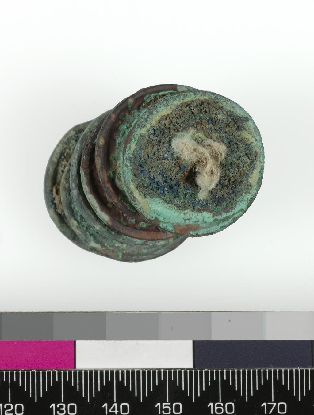 整体造型:呈 “筒子” 状,多枚圆形方孔铜钱因长期埋藏形成的铜锈粘连成束,整体为圆柱体,上端略敞,下端收束,展现出岁月侵蚀后的自然堆叠形态;单枚铜钱直径约 2.5–3 厘米,厚度约 0.1–0.2 厘米,整束高度约 5–8 厘米,兼具历史沧桑感与视觉厚重感。