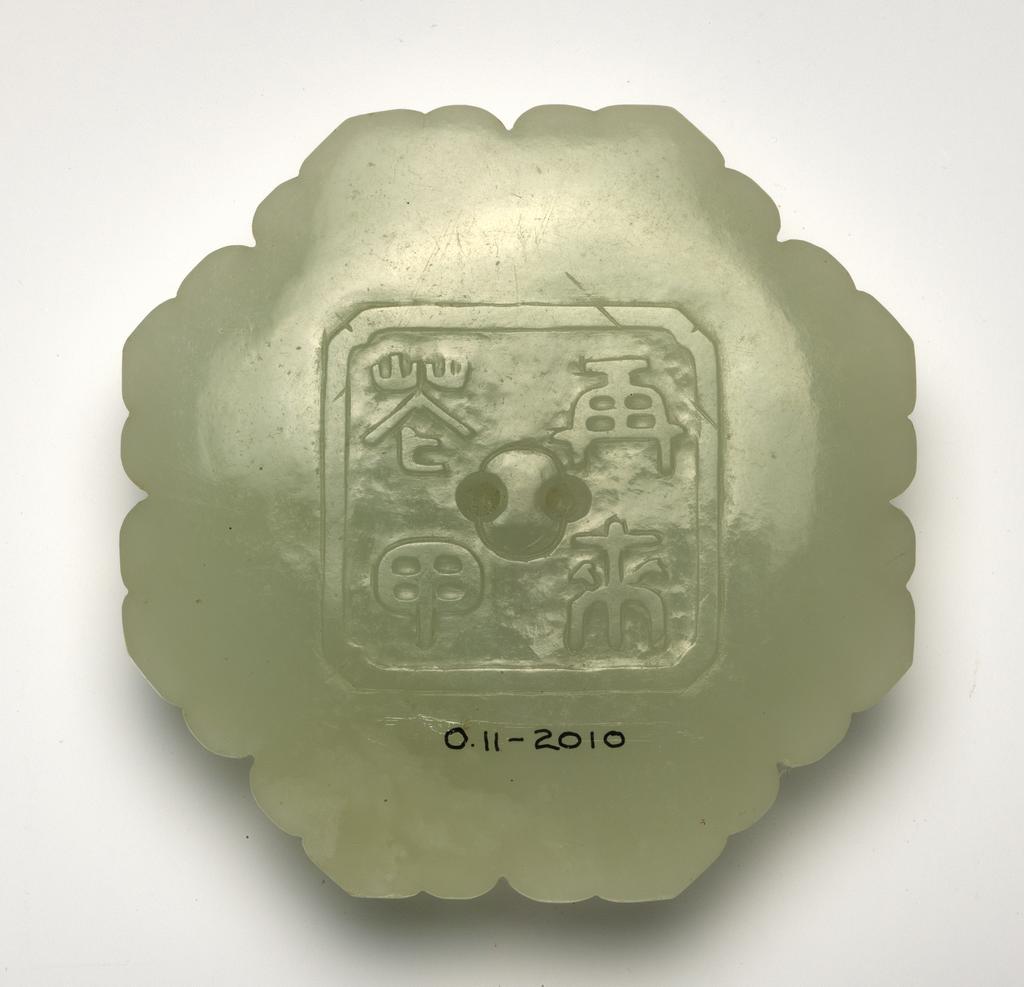 整体造型:呈花口形,器体扁平,边缘如花瓣般曲折灵动,兼具佩饰的装饰性与文化表意功能,整体轮廓精巧雅致,符合清代玉器 “随形就势、注重美感” 的造型特点。
