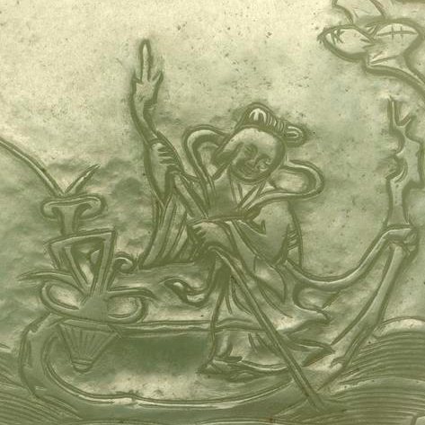 细节:正面采用浅浮雕技法,雕刻一位人物乘舟于海浪之上的场景 —— 人物姿态生动,手持器物(似船桨或法器),舟船造型精巧写实;海浪以细密弧线层层表现,灵动逼真;右上方还雕刻有飞鸟(或蝙蝠,寓意 “福”)纹饰,为画面增添吉祥氛围。背面则雕刻方形区域,内有 “再来花甲” 四字篆书铭文(“花甲” 指 60 岁,“再来” 暗含 “120 岁” 之意,表达祝寿延年的美好祈愿),字体笔画古朴规整;中间设有双孔,推测为穿系佩挂所用,铭文与孔洞的布局严谨,工艺精细,既点明 “祝寿” 主题,又体现清代玉器 “图文结合、表意明确” 的工艺特征。