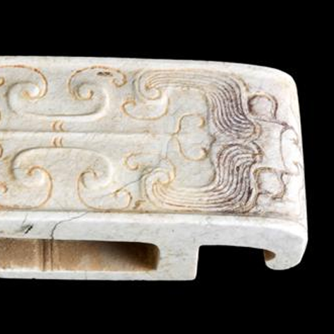 材质与色泽:以和田玉为原料雕琢,玉质原本温润细腻,但历经千年埋藏,表面受沁呈现出白、褐、灰等杂色交织的状态,部分区域因钙化形成斑驳纹理,包浆古朴厚重,既保留了玉材自身的凝脂质感,又因岁月侵蚀增添了沧桑的历史韵味。