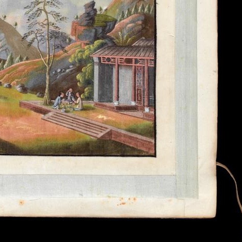 材质与色泽:以通草纸(植物纤维薄片,吸色性强)为绘画载体,水彩颜料绘制;色彩明快自然,山峦以淡紫、灰绿渐变表现层次,茶树呈嫩绿色,人物衣袍为浅蓝、灰褐等朴素色调,亭阁的朱红立柱与青瓦对比鲜明;通草纸因年代久远,边缘泛黄,纸面有细微斑驳痕迹,尽显历史沧桑。