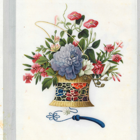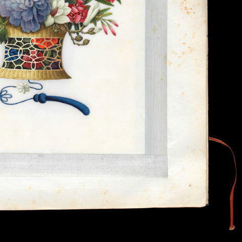 材质与色泽:以通草纸(植物纤维薄片,吸色性强)为绘画载体,水彩颜料绘制;色彩鲜艳明快,花篮的鎏金质感通过金粉与淡墨晕染表现,花卉的粉色、红色、紫色对比强烈,背景大面积留白,突出主体;通草纸因年代久远,边缘泛黄,纸面有细微斑驳痕迹,尽显历史沧桑。