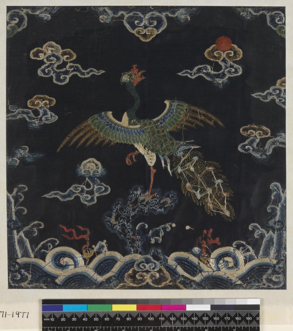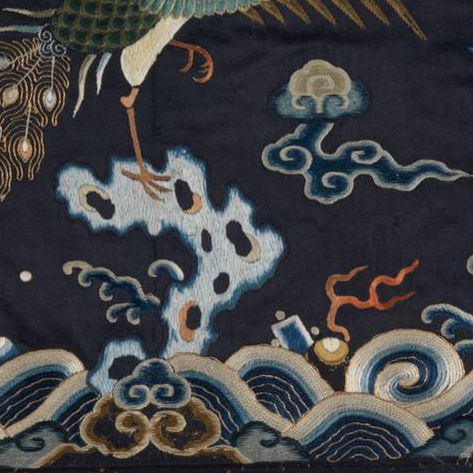 整体造型:呈正方形,边长约 30 厘米,以深蓝色缎纹丝织物为地,采用 “通经断纬” 的刺绣工艺满铺纹样。主体为一只昂首展翅的孔雀,立于祥云之上;周围环绕如意云纹,下方饰海水江崖纹,间杂珊瑚、火珠等吉祥元素,整体布局遵循 “上天下海” 的官补范式,既具等级标识功能,又显视觉张力。