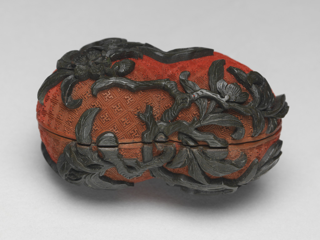 细节:红漆部分雕刻细密的几何纹(如 “卍” 字锦纹)为地子,工艺精细入微;黑漆雕刻的桃枝、叶片、花朵形态逼真,叶脉、花瓣纹理以高浮雕 + 圆雕手法刻画,仿佛从桃身自然延伸而出,生动立体;盒内金漆光亮如镜,与外部红黑纹饰形成视觉反差,更显奢华;盖与盒身的合缝处工艺细腻,边缘打磨光滑,尽显清代漆器 “工细极致” 的制作水准。