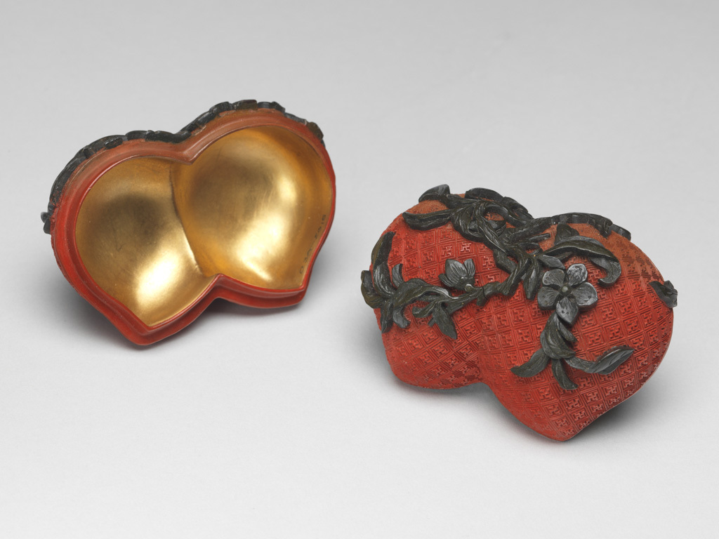 清代是中国漆器工艺的鼎盛期,尤其乾隆年间,宫廷对漆器的需求与推崇推动雕漆(含剔红)工艺达至高峰。此时漆器不仅工艺精湛,还常融合仿生造型(如水果、动植物形态)与吉祥寓意(桃子象征 “长寿”),既供宫廷赏玩,也成为贵族文房、陈设的精美用器。剔红工艺需反复髹漆(少则数十层,多则百余层)、精细雕刻,耗时耗力,体现清代手工艺 “极致追求” 的特点;而 “双桃造型 + 加彩装饰” 的设计,反映了当时 “尚奇、尚精、尚吉祥” 的审美风尚,是清代物质文化与艺术精神的集中体现。同时,清代中晚期,随着中外冲突与不平等贸易,大量精美文物(包括此类高端漆器)被列强掠夺至海外,成为近代中国文化遗产流失的沉痛见证。