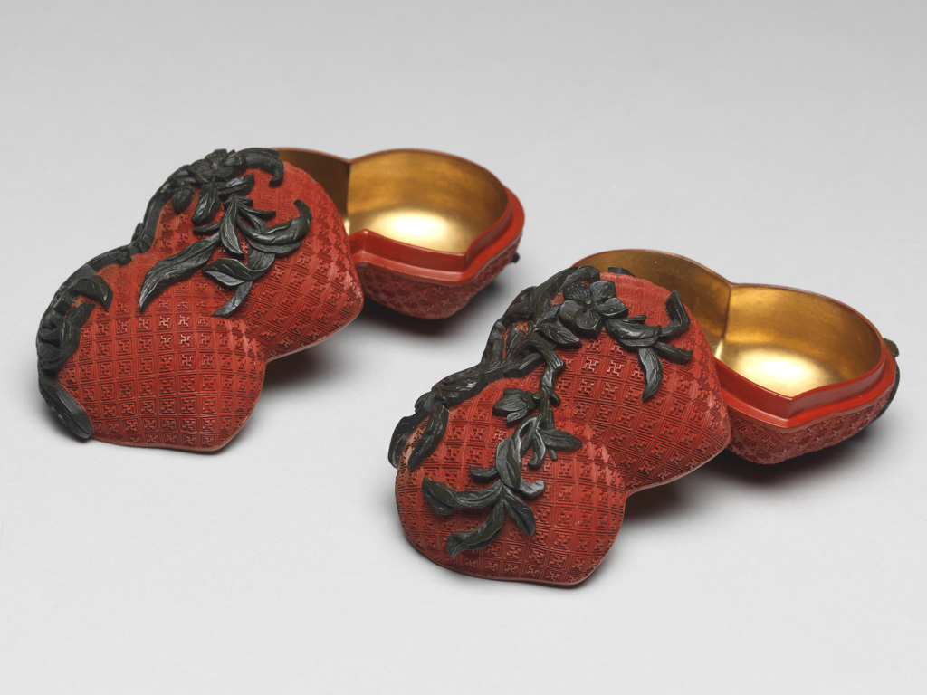 清代剔红加彩双桃形盖盒(一对)