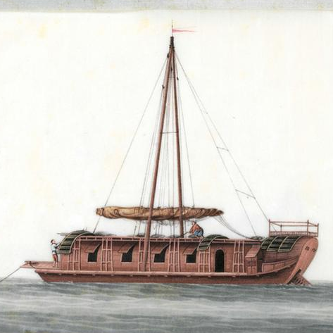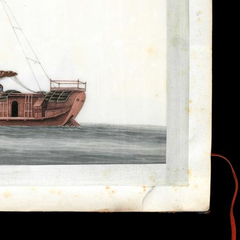 清代(尤其是乾隆二十二年 “一口通商” 后),广州成为中国对外交流的唯一窗口,商贸繁荣催生了大量外销艺术品。通草画因 “便携性 + 观赏性” 成为外销画主流:一方面,西方贵族对 “东方航海、市井生活” 充满好奇,通草画成为他们了解中国社会的视觉载体;另一方面,广州画匠融合 “中国工笔设色” 与 “西方透视写实”,创造出独特的艺术风格。此件《中国帆船图》既迎合欧洲对 “东方航海文明” 的审美想象,又真实记录了清代帆船的构造与海上贸易场景,是 “海上丝绸之路” 文化交流的缩影,见证了中西艺术在商业语境下的碰撞与融合,对研究清代社会生活、外贸史与艺术史均具重要价值。