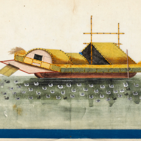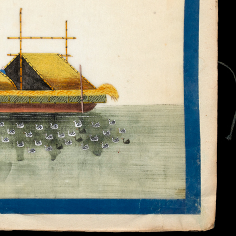 材质与色泽:以通草纸(植物纤维薄片,吸色性强)为绘画载体,水彩颜料绘制;色彩明快自然,船体的棕红质朴厚重,草棚的黄色温暖鲜亮,鸭群的灰、白、黑色调层次丰富;通草纸因年代久远,边缘泛黄,纸面有细微斑驳痕迹,尽显历史沧桑。
