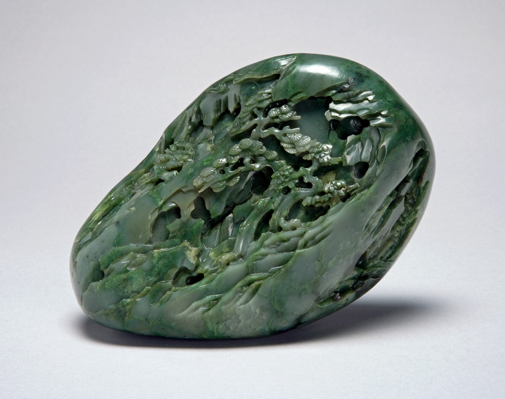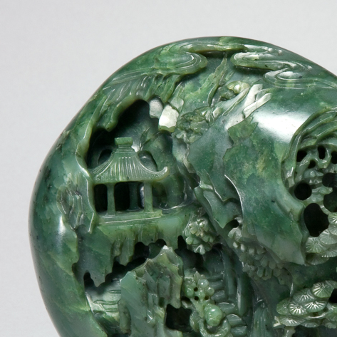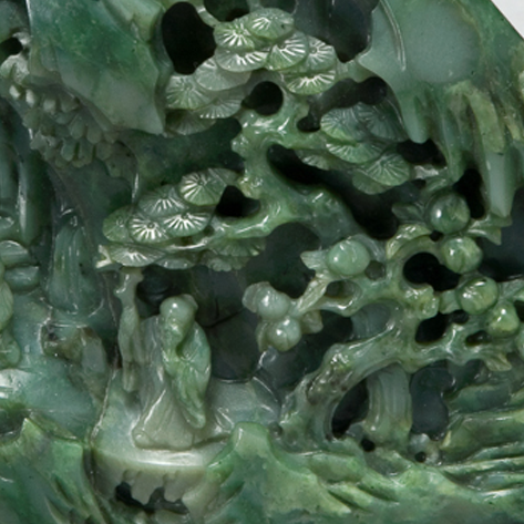 清代是中国玉器发展的巅峰时期,尤其乾隆年间,皇帝对玉器的痴迷与对工艺的极致要求,推动玉雕产业空前繁荣。“玉山子” 作为大型玉雕陈设品,常以山水、人物、典故为题材,既体现 “仁者乐山,智者乐水” 的文人情怀,也彰显宫廷工艺的极致水准。碧玉因色泽深沉华贵,成为宫廷玉雕的重要材质。此件山子不仅见证清代玉雕 “集南北技艺、融文人审美与皇家气派于一体” 的特点,也反映了当时 “大一统” 背景下,工艺文化追求 “极致、典雅” 的时代风貌,是研究清代玉器史、宫廷艺术与文化审美不可或缺的实物资料。