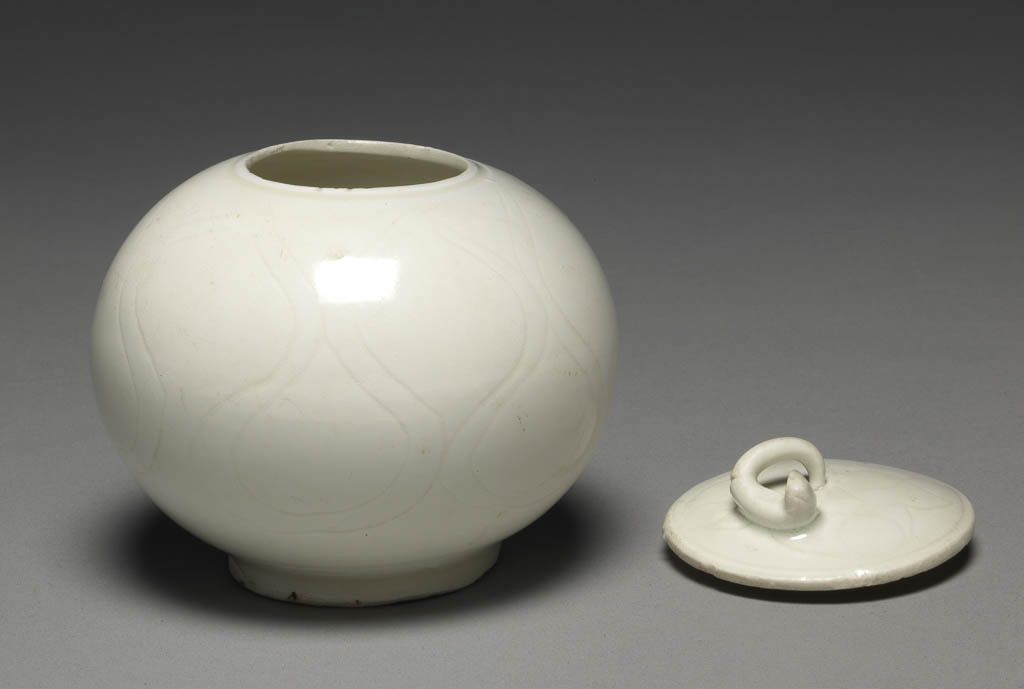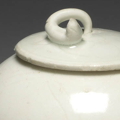 整体造型:呈 “圆腹、短颈、圈足” 的罐形,搭配圆形盖,盖顶设环形钮,器型饱满圆润,线条简洁流畅,既具 “盛储物品” 的实用功能,又因素雅的白釉与精细的划花,成为宋代兼具日用与陈设价值的典型瓷具。