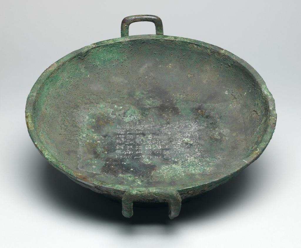 西周是中国青铜文明的 “礼制成熟期”:青铜器从商代 “神权象征” 转变为 “礼制载体”,形成严格的 “列鼎制度” 与器用规范(如 “沃盥之礼” 中,青铜盘与匜配合,以匜浇水、盘承接,象征贵族礼仪秩序)。同时,西周金文(青铜器铭文)高度发达,铭文内容涵盖分封、册命、战争、祭祀等,是研究西周历史的第一手文献。此件青铜盘的兽面纹,体现西周对商代纹饰的继承与简化;铭文则反映当时的文字体系与历史记录传统。它既见证西周青铜工艺 “规范与精美并存” 的技术水平,又映射 “以器载礼、以文记事” 的西周文化特质,是研究西周礼制、文字史与青铜艺术的关键实物。