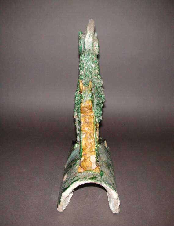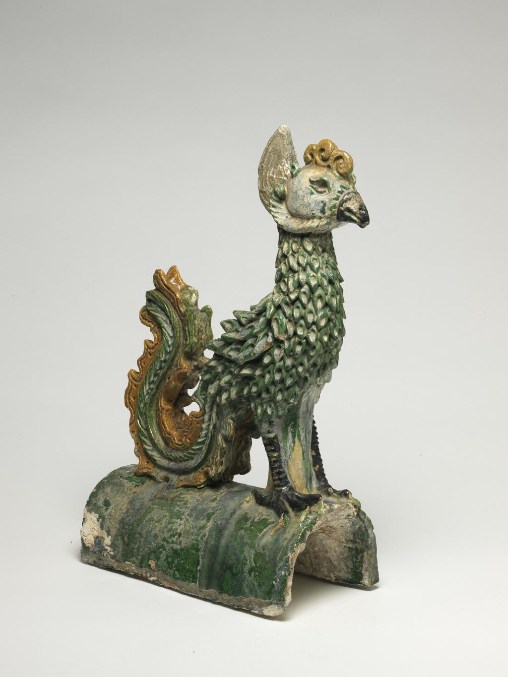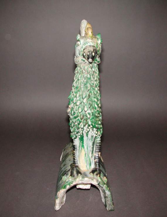 明代是中国琉璃工艺的鼎盛期,琉璃瓦(低温铅釉陶)广泛应用于宫殿、陵寝、祠庙等皇家与礼制建筑,色彩(黄、绿、蓝等)与脊兽造型(龙、凤、狮、天马等)有严格等级规范:黄色为帝王专属,绿色为王公大臣所用,凤凰作为脊饰象征 “吉祥、尊贵”,仅高等级建筑可使用。琉璃脊兽不仅具 “镇宅、防火” 的民俗寓意,更通过造型与色彩彰显建筑主人的身份地位,是封建礼制在建筑装饰上的集中体现。此件凤凰形脊饰既见证明代琉璃工艺 “技术成熟、造型精美” 的水准,也反映了明代 “建筑礼制森严、工艺服务皇权” 的社会文化特质,是研究明代建筑史、工艺史与礼制文化的关键实物。