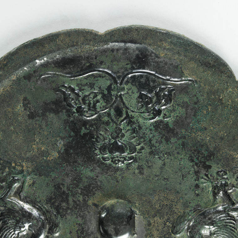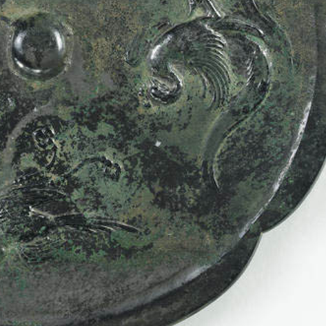 细节:双凤造型夸张,头部高昂,羽毛以阴刻细线表现层次,尾羽卷曲如流云;禽鸟体态写实,喙爪清晰;顶部花卉与火焰宝珠纹线条流畅,火焰纹呈 “三瓣式”,是唐代铜镜常见的吉祥题材;镜缘花瓣边缘打磨光滑,与纹饰区过渡自然,每一处铸造与锈蚀痕迹都彰显唐代青铜工艺 “大气磅礴、工艺精湛” 的特质。