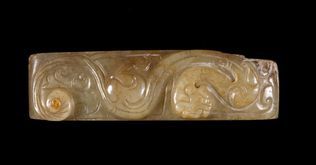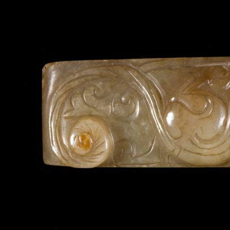 汉代是中国玉文化发展的高峰时期,“玉具剑”(剑首、剑格、剑璏、剑珌皆以玉装饰)成为贵族身份与权力的核心象征(《后汉书》记载 “剑之饰用玉,自天子至士庶有等差”)。和田玉因 “温润坚密” 的特质被奉为玉中上品,广泛应用于礼器、佩饰与葬玉制作。螭龙纹是汉代玉器的典型题材(螭为神话瑞兽,象征辟邪祈福),此剑璏的螭龙雕刻既体现了汉代 “尚武精神与崇玉文化相结合” 的风尚,也反映出汉代玉雕工艺 “从商周的神秘性向生活化、艺术化转变” 的趋势,是研究汉代玉器工艺、礼仪制度与审美观念的关键实物。