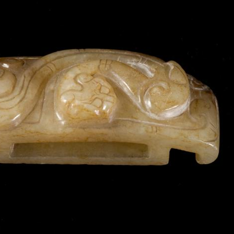 整体造型:呈长条形,底部设有长方形穿带孔(用于穿系腰带,将剑鞘固定于腰间),顶部为弧面并雕刻纹饰,是古代 “玉具剑” 中兼具实用功能与装饰性的关键构件,造型规整且符合佩剑的力学与礼仪需求。