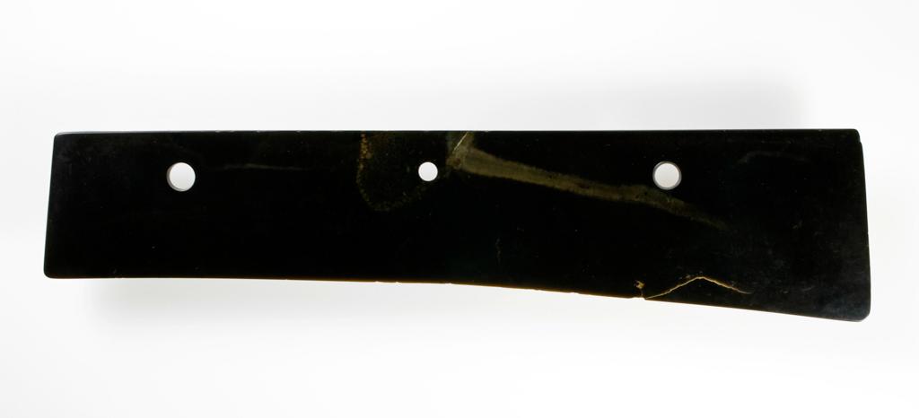 细节:器身打磨光滑,边缘经精细修整,无明显棱角;三个钻孔圆润规整,孔壁光滑(反映新石器时代晚期成熟的钻孔工艺);残缺处可见岁月与使用留下的自然痕迹,器身无人工纹饰,以 “素面” 风格凸显墨玉本身的材质之美,尽显新石器时代 “尚简重质” 的工艺与审美特点。