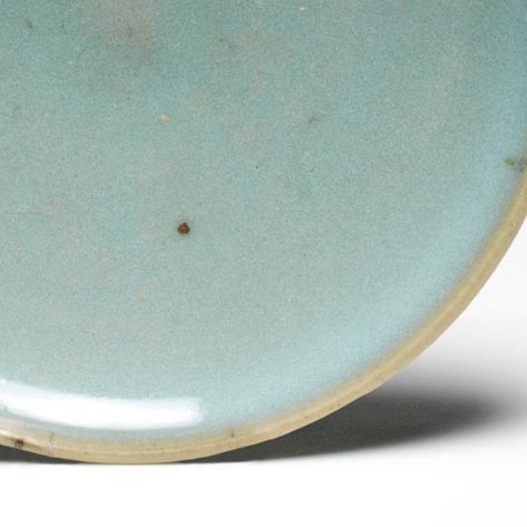 细节:盘内釉面匀净,偶见细微 “棕眼”(釉面小孔)与自然斑点,是钧窑高温烧制时釉料流动、气泡逸出的痕迹;口沿因釉水垂流,形成一圈薄釉边,显淡淡的胎色(“芒口” 效果);圈足修胎利落,底部中心微凹,釉层在圈足边缘自然收束,每一处细节都彰显宋代钧窑 “窑变天然、工艺古朴” 的特质。