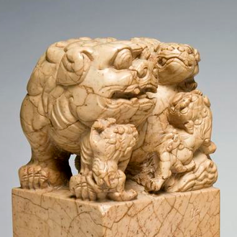 细节:狮身以圆雕 + 浮雕结合,肌肉线条饱满,鬃毛、爪部刻画写实,幼狮攀爬于母狮身侧,神态生动;印体表面隐见阴刻文字痕迹(因磨损模糊不清),推测为藏家题款或印文;冰裂纹自然分布,与雕刻的狮纹形成 “刚柔并济” 的视觉层次,每一处雕琢与石质纹理都彰显清代寿山石雕 “因材施艺、工艺精湛” 的特点。