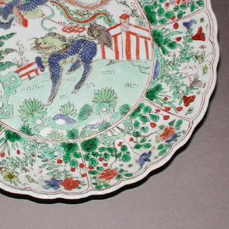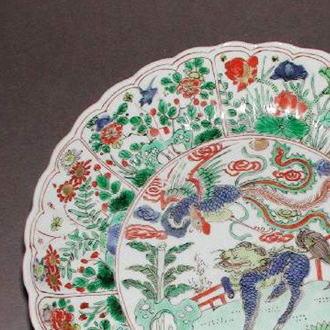 明代万历年间,景德镇官窑五彩瓷工艺达至巅峰,“五彩”(红、绿、黄、蓝、紫等色结合)成为宫廷用瓷的主流装饰技法,题材多为吉祥瑞兽(如麒麟、凤凰象征 “威凤祥麟,天下太平”),反映万历朝 “尚吉、尚奢” 的审美风尚。此时商品经济繁荣,官窑瓷器除宫廷使用外,也通过 “官搭民烧” 等方式流入民间,部分精品更被海外藏家追捧。此五彩盘的麒麟凤凰纹、花口造型与浓艳色彩,既见证明代万历五彩 “从宫廷到民间、从实用到艺术化” 的演变,也为研究明代官窑制度、陶瓷工艺与中外文化交流提供了关键实物。