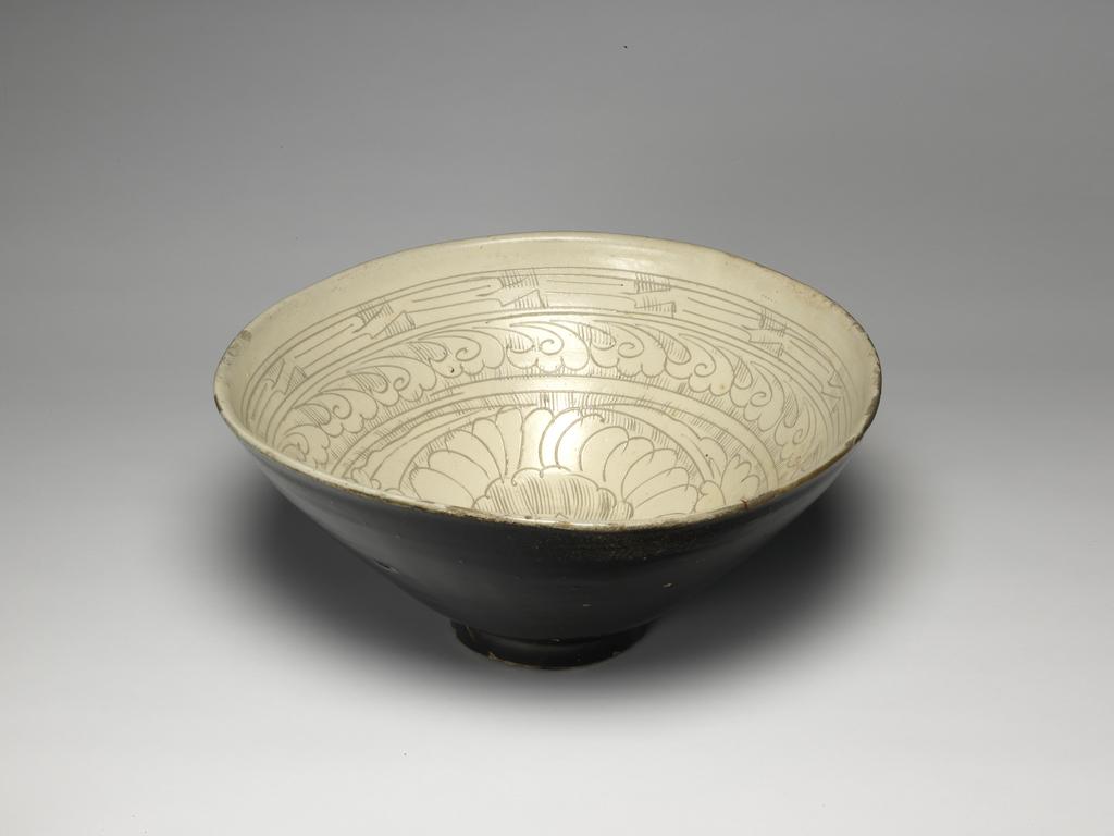 宋代磁州窑白地划花黑釉斗笠碗