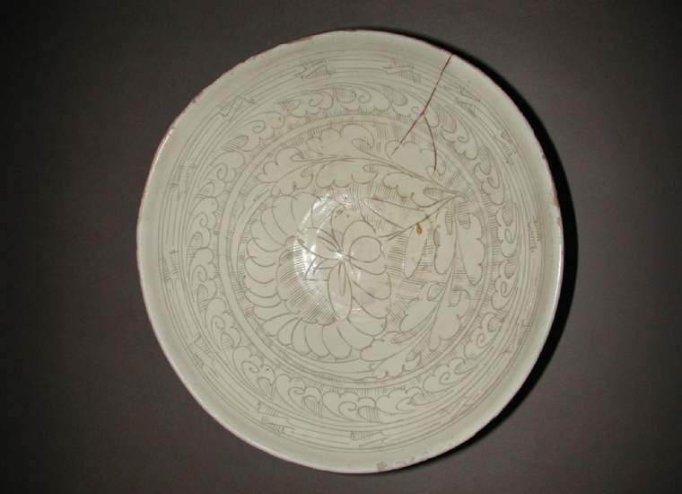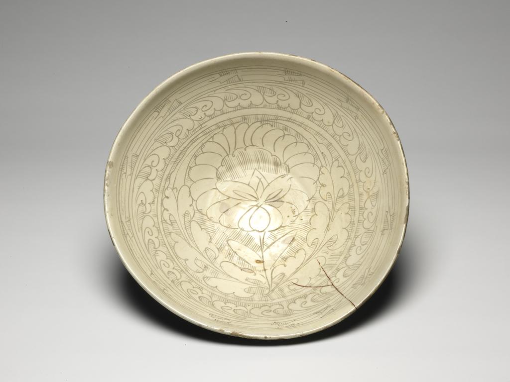 细节:碗内采用划花工艺—— 在施有白化妆土的胎体上,以纤细工具划出花卉、卷草纹等纹样,纹饰从碗心向口沿呈放射状分布:碗心花卉造型生动,卷草纹线条婉转流畅;划花线条深浅有致,在白釉衬托下清晰可辨,尽显磁州窑 “以刀代笔、简笔传神” 的工艺特点;碗口沿与圈足因岁月侵蚀、使用磨损,有细微痕迹,更添历史沧桑感,每一处划花、釉色过渡,都彰显宋代磁州窑 “粗料细作、质朴灵动” 的艺术风格。