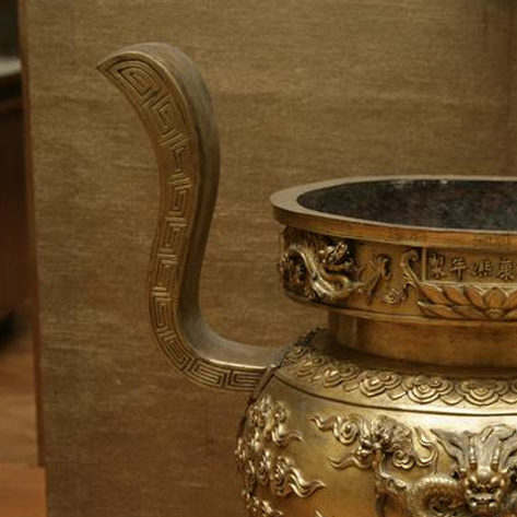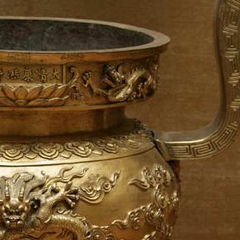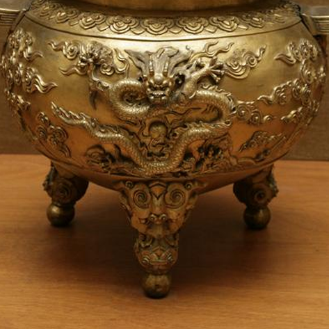 清代康熙朝是中国传统工艺 “复古与创新并举” 的关键时期,宫廷铜器制作继承明代 “宣德炉” 的工艺精髓,又融入 “皇权象征” 的龙纹题材(龙为帝王专属纹样,彰显至高无上的统治权威)。鎏金工艺(将黄金锤箔、熔化后镀于铜胎)在康熙朝被广泛应用于礼器与陈设器,既体现 “盛世重器” 的华贵气象,也反映 “礼制复兴” 的政治需求(通过精美器物强化皇权合法性)。此香炉的云龙纹、双龙耳与鎏金工艺,既见证明代铜炉工艺的传承,也映射康熙朝 “文治武功、崇礼重器” 的时代风貌,是研究清代宫廷铜器制度、工艺史与皇权文化的核心实物。