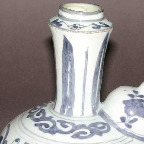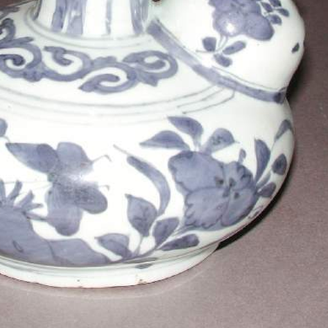 明代晚期(万历至崇祯)是景德镇民窑瓷业 “转型与扩张” 的关键期,外销瓷贸易因 “海上丝绸之路” 的繁荣达到顶峰,东南亚(如印尼、马来西亚)的伊斯兰教徒是军持的主要使用者(用于宗教 “小净”)。此时民窑青花工艺 “从精工细作转向写意粗放”,题材贴近自然(花卉、昆虫),既满足国内文人士大夫 “尚雅” 审美,又契合海外市场 “实用与装饰并重” 的需求。军持的造型演变(从唐代 “细颈长流” 到明代 “乳状流扁腹”)反映了 “宗教器物世俗化、艺术化” 的趋势,此件青花军持的花卉昆虫纹、灰蓝发色与外销特征,既见证明代民窑 “适应多元市场、工艺灵活创新” 的辉煌,也为研究明代中外陶瓷贸易、宗教文化交流与民窑青花史提供了关键实物。