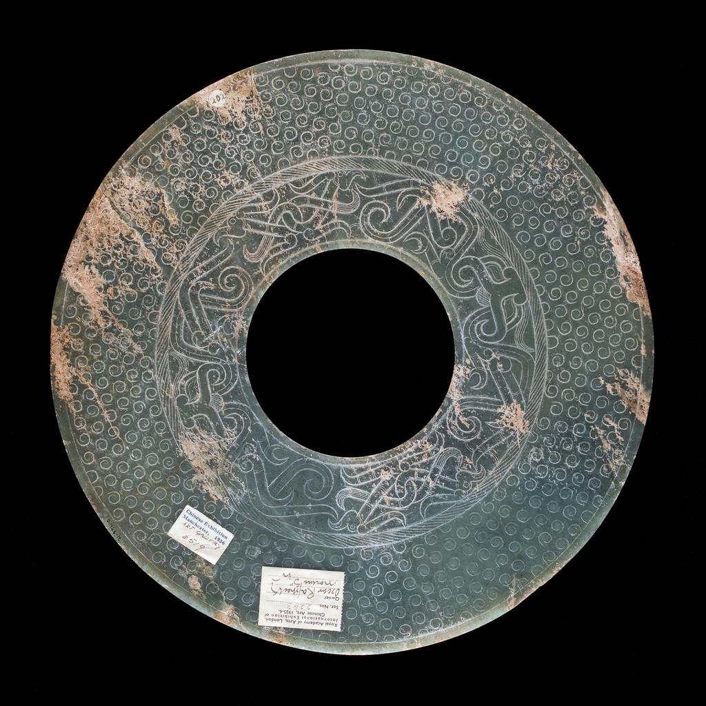 整体造型:呈圆形,中间有一个圆孔,是典型的玉璧造型。玉璧的整体轮廓规整,线条流畅,展现出古朴而庄重的美感,这种造型在战国时期的玉器中较为常见,具有很高的代表性。