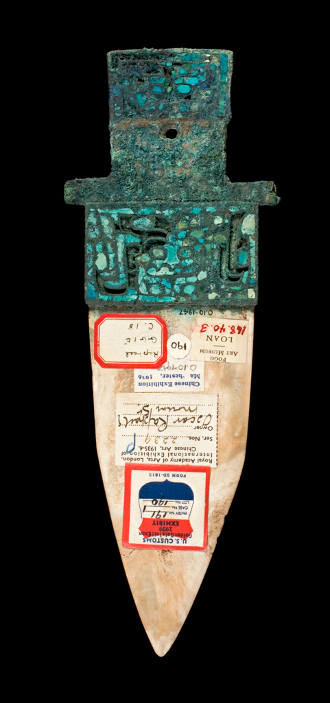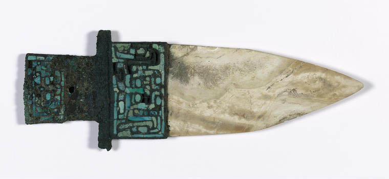 细节:青铜内上镶嵌着精美的绿松石,组成兽面纹等图案,绿松石排列整齐,与青铜底色相互映衬,色彩对比鲜明,富有装饰性 。玉石援部虽简洁,但打磨光滑,边缘锋利 。阑上也有一些细微的铸造痕迹,显示出商代高超的青铜铸造工艺和玉石加工技艺 。