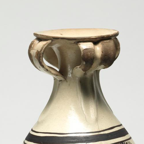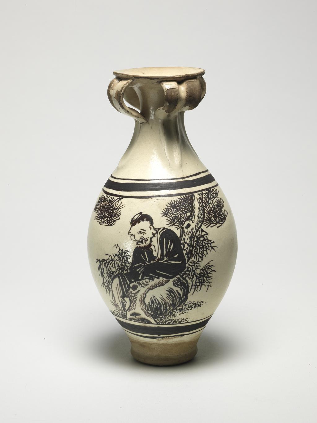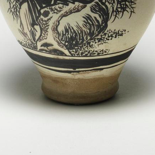 细节:瓶身绘有精美的人物纹饰,人物刻画细腻,神态栩栩如生。人物或坐或倚,周围搭配以松树、柳枝等植物纹饰,营造出一种闲适的氛围。纹饰线条流畅,笔法娴熟,体现了宋代磁州窑工匠高超的绘画技艺。此外,瓶口的花口设计独特,边缘微微卷曲,增加了器物的美感和艺术价值。