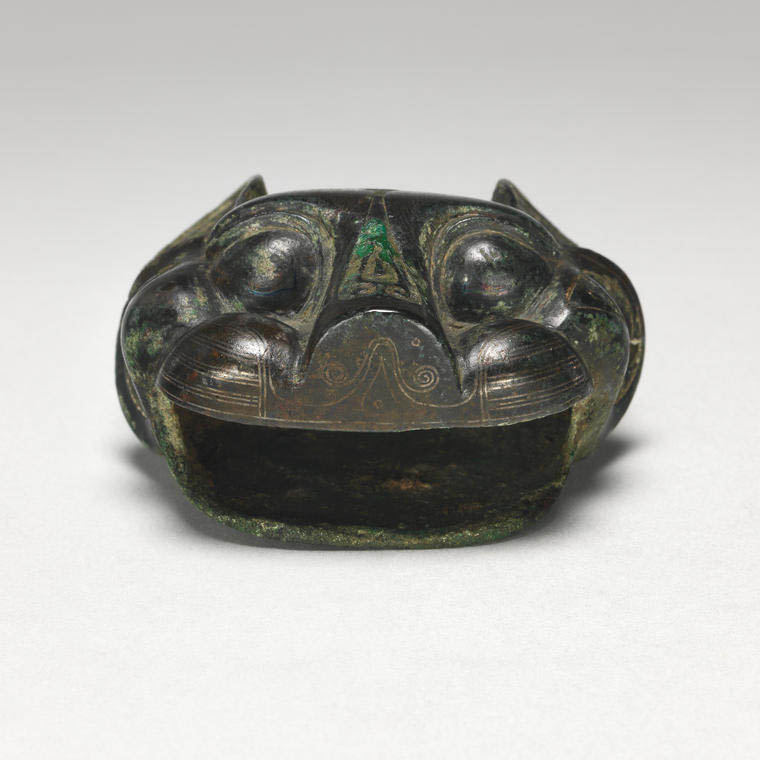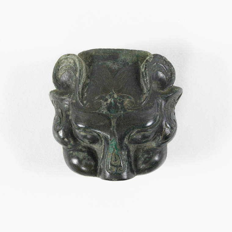 整体造型:呈兽首形状,造型独特且富有张力,展现出一种威严与神秘的气息。兽首的轮廓清晰,线条流畅,具有很强的立体感,仿佛是从真实的兽类头部提炼而来,体现出战国时期工匠对动物形态的细致观察和高超的艺术表现力。