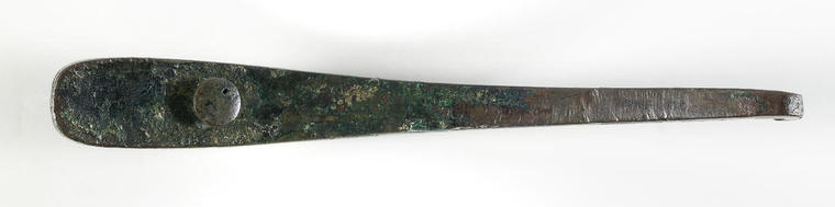 整体造型:带钩整体呈长条形,略微弯曲,符合带钩便于束腰佩物的实用功能。一端较宽,为钩头,另一端较窄,线条流畅自然,造型简洁而富有美感。