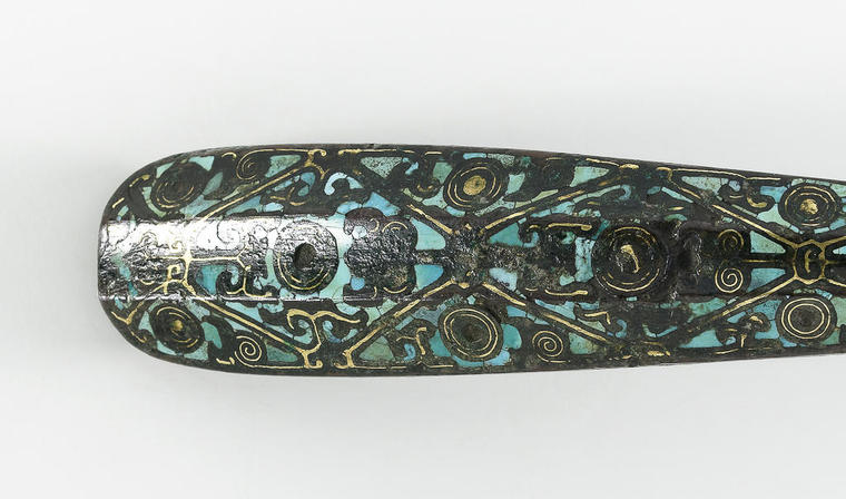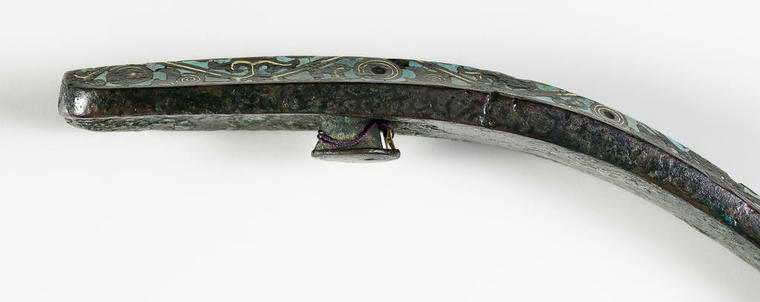 战国时期,社会处于大变革、大发展阶段,青铜铸造工艺达到了很高的水平。带钩作为一种实用的服饰配件,在当时广泛流行,不仅具有束紧腰带的实用功能,同时也是身份地位的象征。错金银和镶嵌工艺在战国时期发展成熟,被大量应用于青铜器的装饰上。工匠们通过这些工艺,将青铜器装饰得精美华丽,展现出高超的艺术水准。错金银工艺是先在青铜器表面錾刻出图案凹槽,再将金银丝嵌入,最后打磨平整;镶嵌绿松石则需要精准的切割和镶嵌技术。这些工艺的运用,反映了战国时期手工业的高度发达,以及人们对美的追求和对生活品质的重视。这件错金银嵌绿松石青铜带钩,就是战国时期青铜艺术的杰出代表,却因列强的侵略掠夺,被迫流落到海外,成为中国文物流失历史的见证。