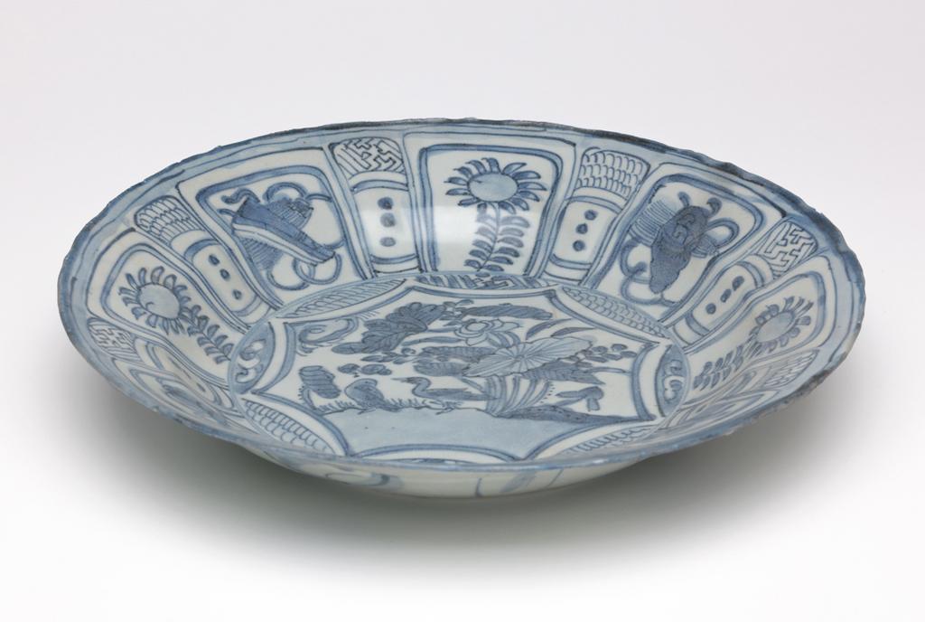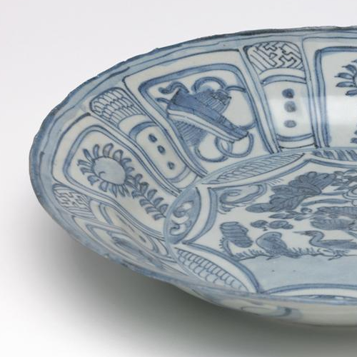 细节:盘心主体纹饰为莲池鸳鸯图,描绘了鸳鸯在莲池中嬉戏的场景,莲花盛开,荷叶舒展,鸳鸯姿态生动,充满了生活气息和自然情趣。盘的边缘以青花绘制了多个开光图案,每个开光内分别绘有不同的花卉、杂宝等纹饰,图案丰富多样,布局合理,线条流畅,展现了元代青花瓷绘画技艺的高超水准。盘的外壁也有简单的青花线条装饰,增加了器物的层次感。