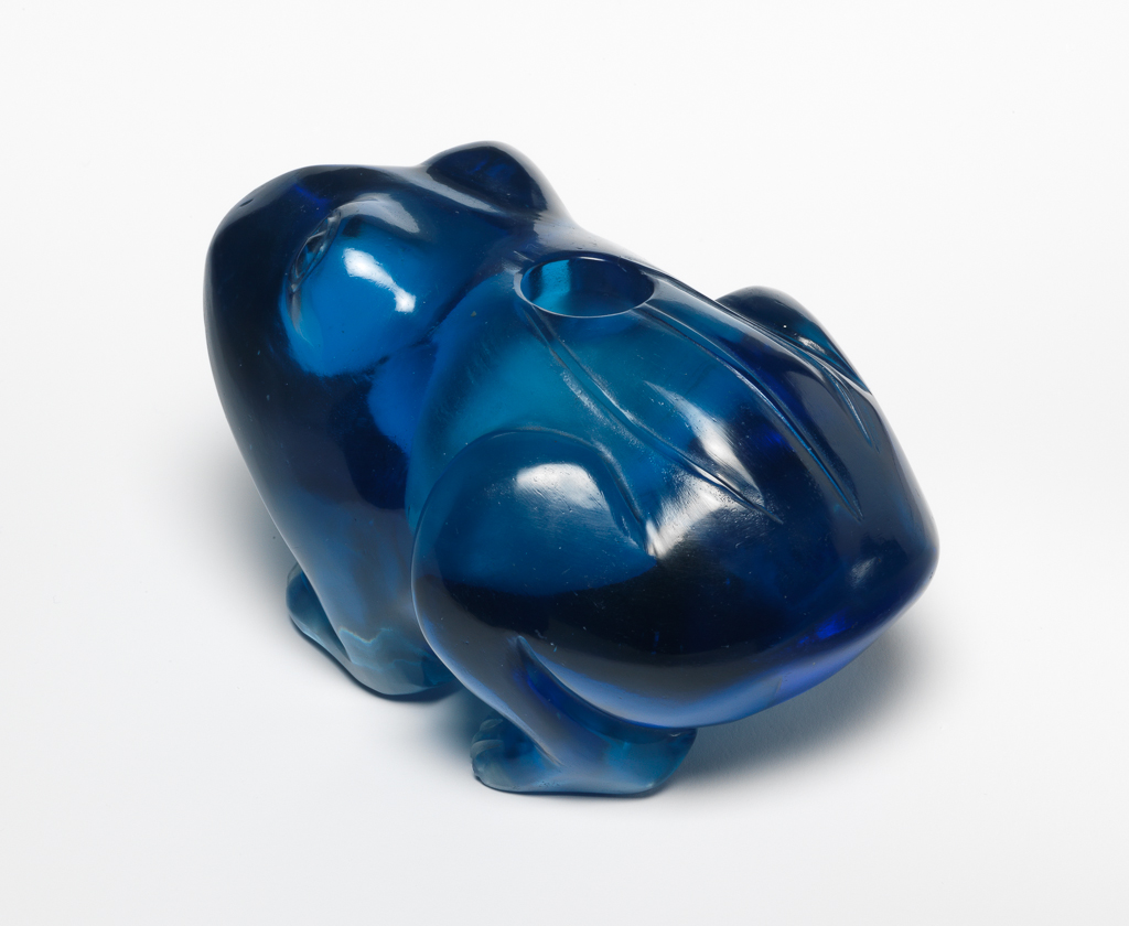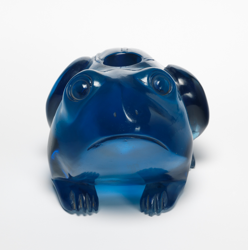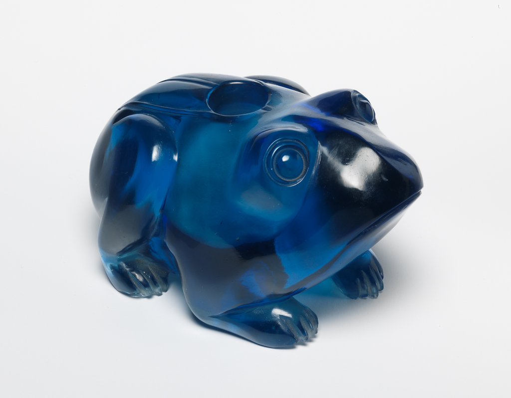 清代,随着中外文化交流的日益频繁,玻璃制作工艺在继承中国前代传统技术的基础上,又广泛吸收了西方的一些先进技术,得到了进一步的发展与提升。宫廷内务府造办处专门设立了玻璃厂,集中了一批技艺精湛的工匠,他们全身心地为皇室制作各种精美的玻璃器皿。这些玻璃制品造型丰富多样,涵盖了瓶、碗、水盂、鼻烟壶等诸多品类,在装饰手法上也极为多样,运用了雕刻、彩绘等多种工艺。文房用具在清代深受文人阶层的重视,像蛙形水盂这类既具有实用功能又富有艺术价值的文房器物颇为流行。它们不仅体现了工匠高超的制作技艺,也深刻反映了当时文人的审美情趣以及对生活品质的追求。然而,由于近代中国遭受列强的侵略与掠夺,许多珍贵的清代玻璃制品,如这件蓝料玻璃蛙形水盂,被迫流落到海外,成为了中国文物流失历史的惨痛见证,时刻提醒着我们那段屈辱的过往与保护文化遗产的重要性。