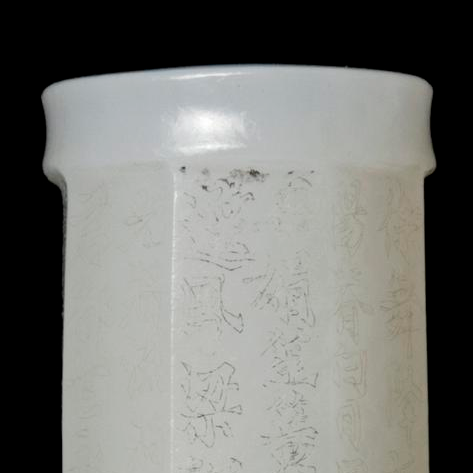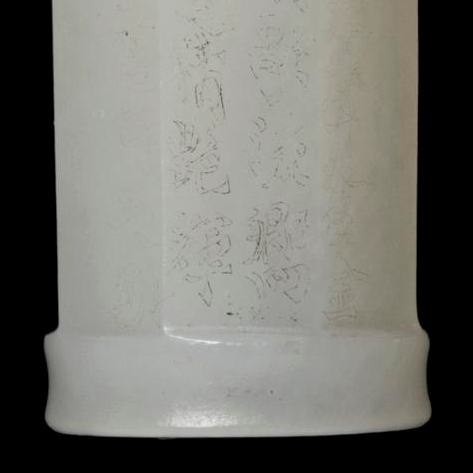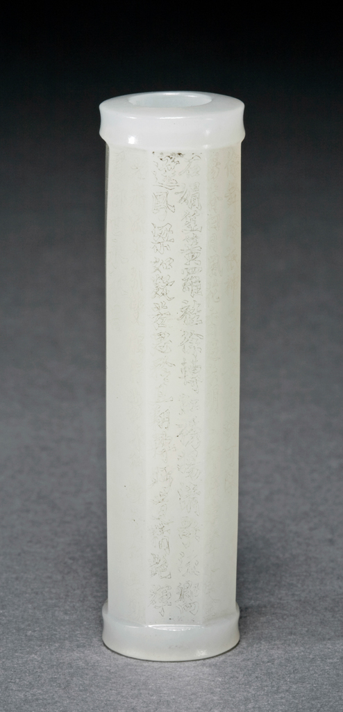 细节:器身表面阴刻有诗文,字体工整,笔画细腻,虽历经岁月仍清晰可辨,展现了清代玉雕工匠高超的刻字技艺。诗文的布局合理,与器型完美结合,体现了当时文人与工匠的默契配合。器身的竹节装饰雕刻精细,模拟出竹节的纹理和形态,栩栩如生,增添了器物的艺术韵味。