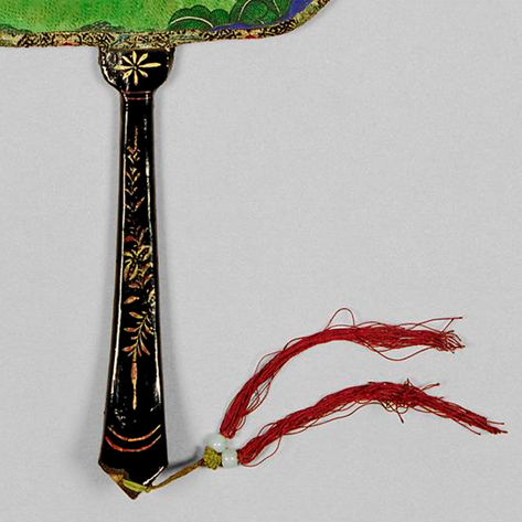 细节:扇面的人物形象刻画细致,服饰、神态各异,场景中的建筑、树木、山石等元素也描绘得栩栩如生,体现了高超的绘画技艺。扇柄的漆艺花纹线条流畅,工艺精湛,流苏的红色丝线质地细腻,与整体风格相得益彰。扇面边缘和扇柄处的装饰细节丰富,展现了清代工匠对细节的极致追求。