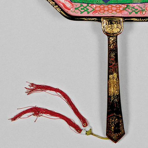 细节:扇面的仕女形象刻画细致,服饰、神态各异,手中或持书卷,或赏古玩,场景中的博古架、花瓶、荷花等元素也描绘得栩栩如生,体现了高超的绘画技艺。扇柄的漆艺花纹线条流畅,工艺精湛,流苏的红色丝线质地细腻,与整体风格相得益彰。扇面边缘的装饰细节丰富,有回纹、花卉纹等,展现了清代工匠对细节的极致追求。