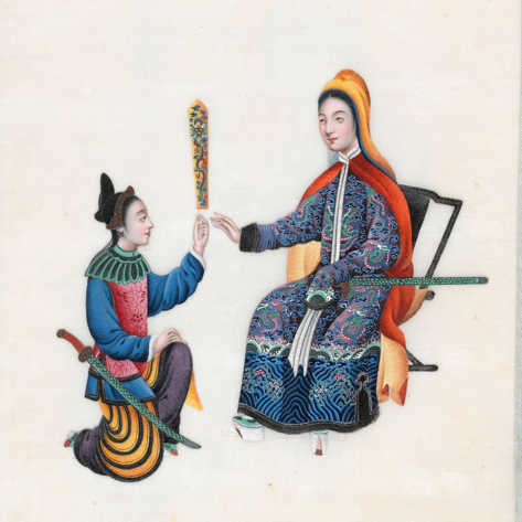 整体造型:为一页装裱的绢本绘画,画面呈现出古代人物互动的场景,布局规整,人物形象鲜明,具有典型的清代绘画风格,兼具艺术欣赏与历史研究价值。