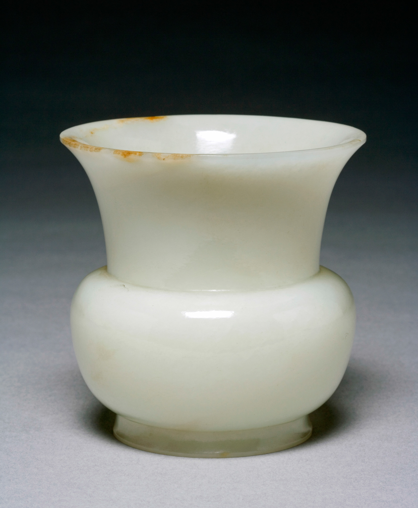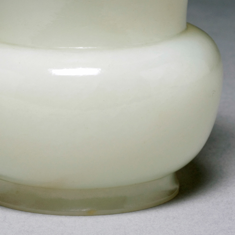 细节:器身光素无纹,以玉质本身的温润质感和简洁的造型取胜,这种 “素器” 风格在清代玉器中较为常见,体现了工匠对玉质本身价值的尊崇以及对简约美学的追求。口沿的撇口设计工艺考究,边缘打磨光滑圆润;圈足部分规整,底部打磨精细,每一处细节都反映出清代玉器工匠高超的雕琢技艺和对器物品质的严格要求。