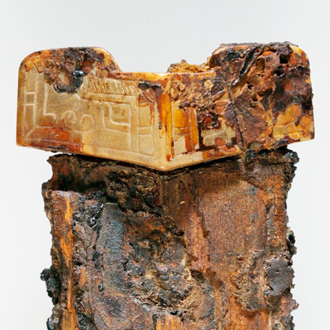 细节:玉质构件上有雕刻的痕迹,隐约可见一些几何纹饰或简单的图案,线条古朴简洁,体现了商代玉器雕刻的风格。青铜部分表面有铸造留下的痕迹,以及因长期埋藏和氧化形成的复杂锈层纹理,反映出商代青铜器铸造工艺的特点 ,同时,玉石与青铜的嵌合处,能看出当时的镶嵌工艺,虽然历经岁月,部分连接部位可能已经松动,但仍能看出其曾经的精巧构造。