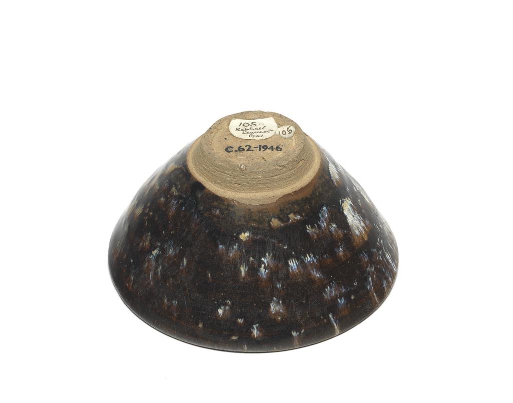 整体造型:盏为斗笠形,口沿外撇,腹部斜收,底部为小圈足,整体造型简洁大方,线条流畅自然,符合宋代茶具 “简约实用” 的风格特点,是典型的宋代饮茶器具。
