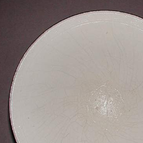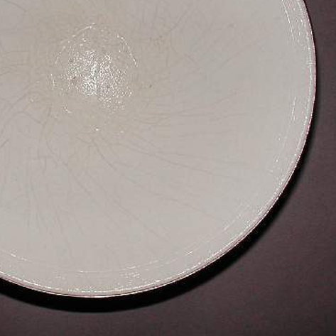 细节:碗的内壁刻有精美的花纹,花纹线条流畅,构图严谨,虽然从图片中看刻花细节不是特别清晰,但仍能感受到其雕刻工艺的精湛。碗的圈足部分处理规整,露胎处可见胎质的洁白细腻。釉面分布着自然形成的开片纹,这些开片纹细密均匀,如同冰裂纹,为器物增添了一种古朴雅致的韵味,每一处细节都展现出北宋定窑瓷器高超的工艺水平和艺术魅力。