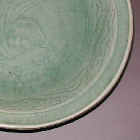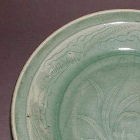 细节:盘的内壁刻有精美的鱼藻纹,鱼的形象生动活泼,姿态各异,周围环绕着水藻等纹饰,线条流畅婉转,刀法娴熟,展现出明代工匠高超的刻花技艺。花纹的布局疏密有致,与青釉相互映衬,既丰富了器物的装饰性,又不失简洁素雅的风格。盘的圈足部分处理规整,露胎处可见胎质的坚实,每一处细节都展现出明代龙泉窑瓷器工艺的精湛水平和艺术魅力。