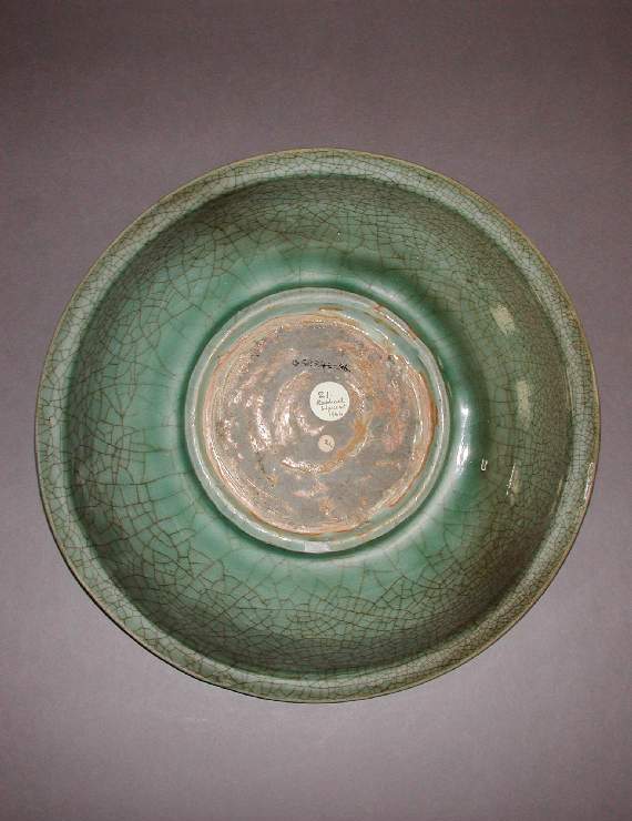 整体造型:盘为敞口状,口沿较宽,腹部较浅,底部为圈足,整体造型规整,线条简洁明快,符合明代龙泉窑盘类器物的典型造型特征,既具有实用的盛放功能,又兼具一定的装饰性,是明代日常生活和礼仪活动中常用的瓷器之一。