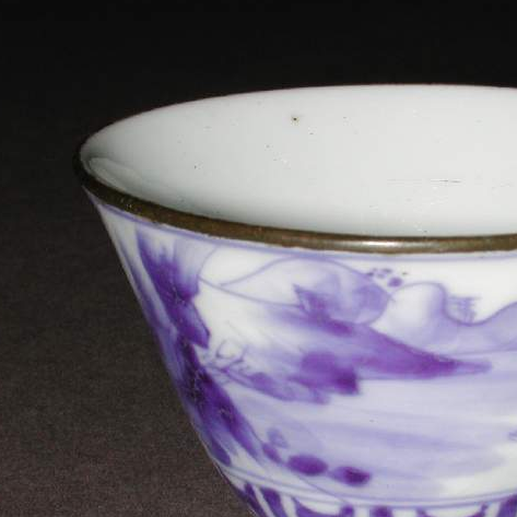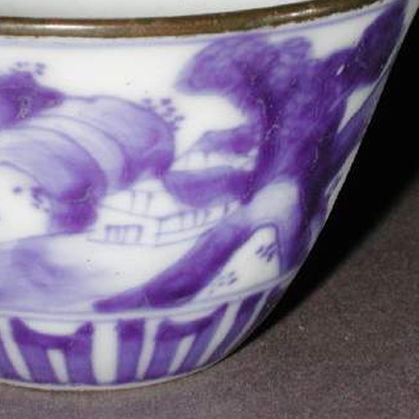 细节:杯身描绘了山水纹,画面中有山峦、树木、房屋、船只等元素,构图疏密有致,笔法细腻流畅,展现出清代青花绘画工艺的精湛水平。杯口边缘有一圈金属镶边,可能是为了保护杯口或增加装饰效果,金属的色泽与青花的蓝色形成对比,增添了器物的精致感。每一处细节都展现出清代制瓷工匠的高超技艺和艺术创造力。