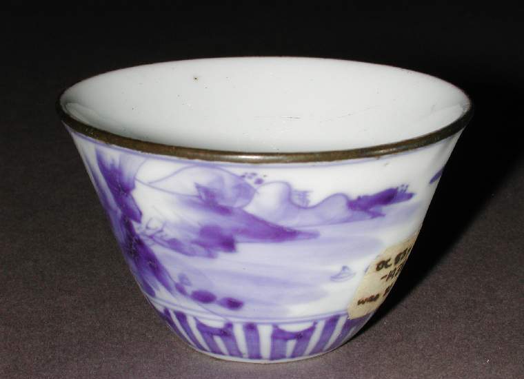 19 世纪末至 20 世纪初,西方列强对中国发动了多次侵略战争,如第二次鸦片战争、八国联军侵华战争等。在这些战争期间,列强的军队闯入中国的城市、乡村,对各类文物古迹进行了疯狂的掠夺。清代的青花瓷器工艺精湛,深受世人喜爱,成为了列强掠夺的重要目标之一。这件清代青花山水纹杯,可能原是中国民间或贵族家庭的日常用品或收藏品。在战乱中,被列强士兵或文物贩子发现并抢夺,随后被非法带往海外。经过一系列的转手交易,最终流入剑桥大学费兹威廉博物馆,成为该馆展示中国古代瓷器艺术的重要藏品,见证了近代中国文物遭受掠夺的屈辱历史。