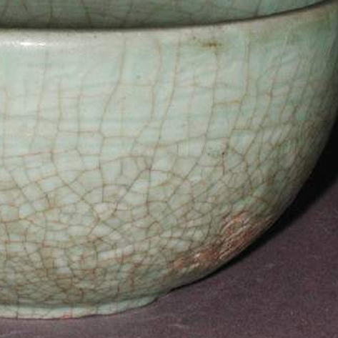 细节:碗的内壁刻有精美的花纹,虽然花纹因岁月和釉色的覆盖显得若隐若现,但仍能看出其线条流畅婉转,刀法娴熟。这些刻花纹饰可能是花卉、云纹等常见的宋代装饰题材,增添了器物的艺术韵味。碗的圈足部分处理精细,底部微微泛黄,这是由于烧制过程和岁月侵蚀所形成的自然痕迹,更凸显了其历史的厚重感。此外,釉面还分布着典型的开片纹,开片纹路细密,如同冰裂,这是南宋龙泉窑瓷器在烧制过程中自然形成的,为器物增添了古朴雅致的韵味。