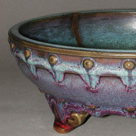 细节:口沿的鼓钉大小均匀,与器身衔接自然流畅。腹部有一道明显裂纹,应为烧制或流传过程中产生,裂纹处经修复,留有金色修复痕迹,反映出文物的历史沧桑感。三个如意形足造型优美,足部釉色与器身呼应,尽显钧窑工艺精湛水平,每一处细节都彰显出北宋钧窑瓷器的艺术魅力与历史价值。